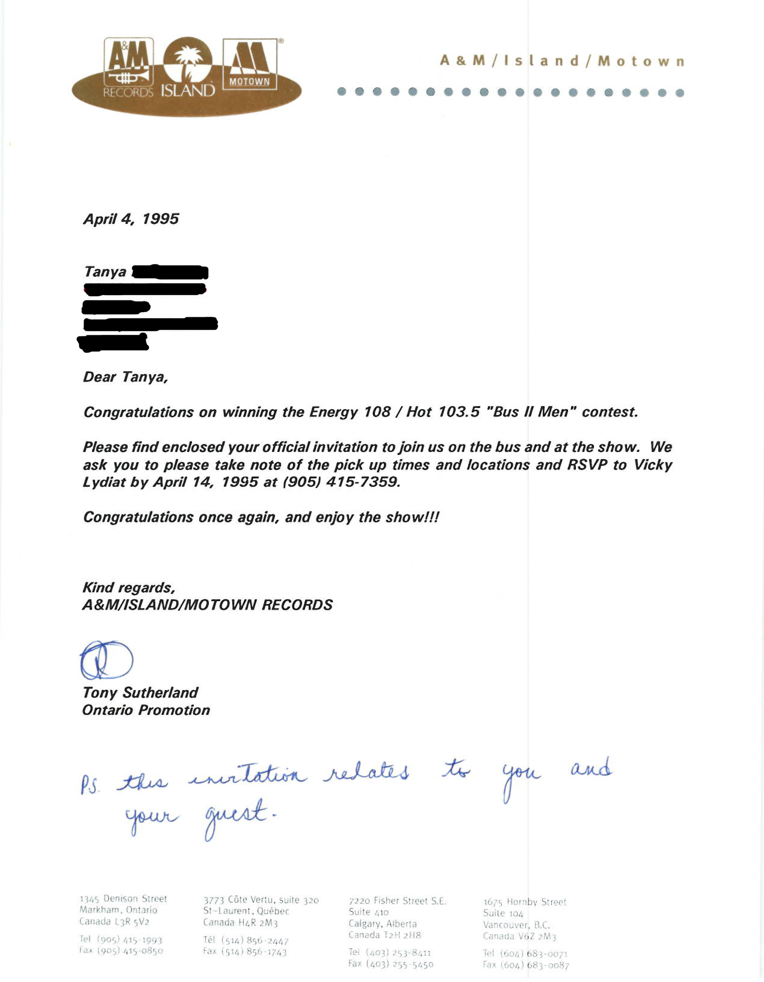 She came out and asked me what was wrong. I told her I won the tickets, and we were going to see Boys II Men in Buffalo! So after doing a dance, her instructor congratulated me and asked me to leave, I waited for my tickets to arrive.
