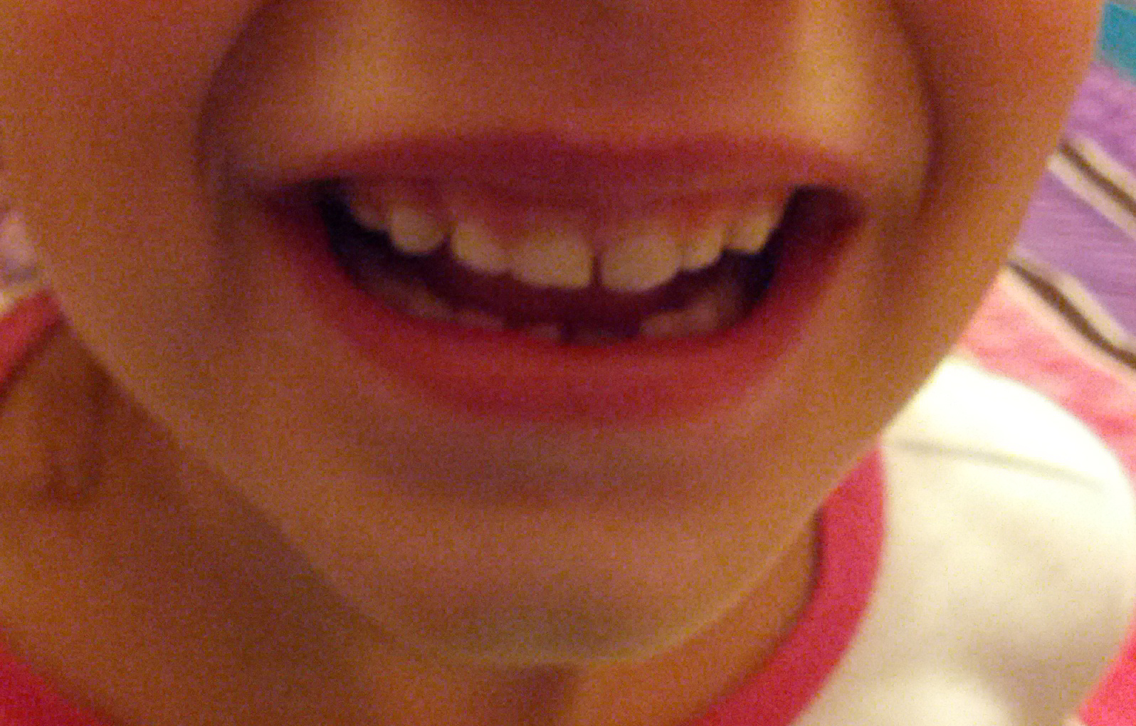 Her bottom front tooth has been loose for a while now, and the actual adult tooth has started to grow in. That baby tooth has been almost horizontal for about two weeks, and I’m not really sure what was holding it there, but she wouldn’t let me touch it; too afraid I would make it bleed. But last night, in the middle of the story, she said it was hurting her.