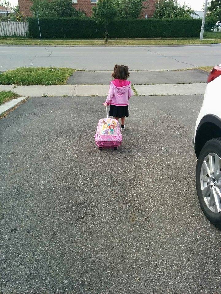 Let’s take the Little Mouse and school. Her first day of school was on the Friday of that first week and she was so excited to go. I made her pose for all the obligatory first day pictures, as I did with her sister and packed their lunches and we were off. We dropped the Little Bird off first, in the school yard. The Little Bird put her backpack in line for her class, and the Little Mouse put hers right behind it, thinking that’s what she was supposed to do. After telling her that her classroom was in the front of the school, she looked a little sad to say goodbye to her sister.