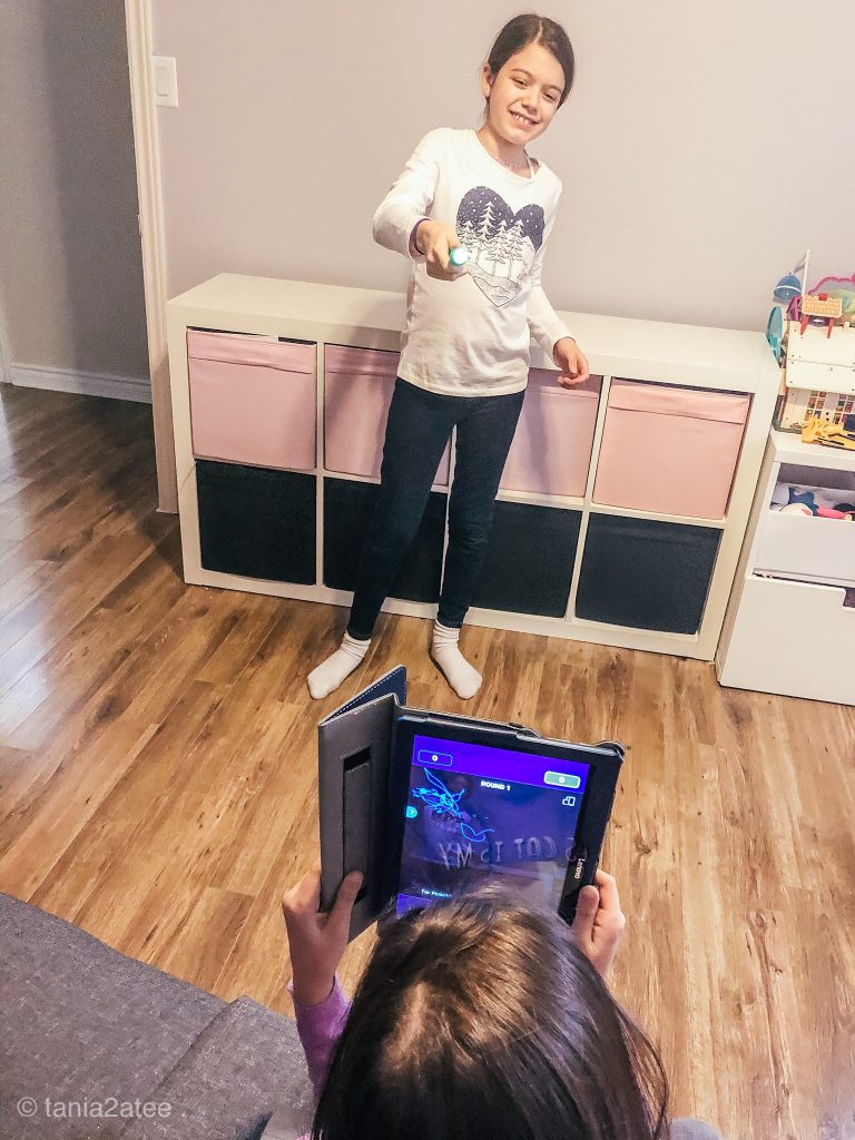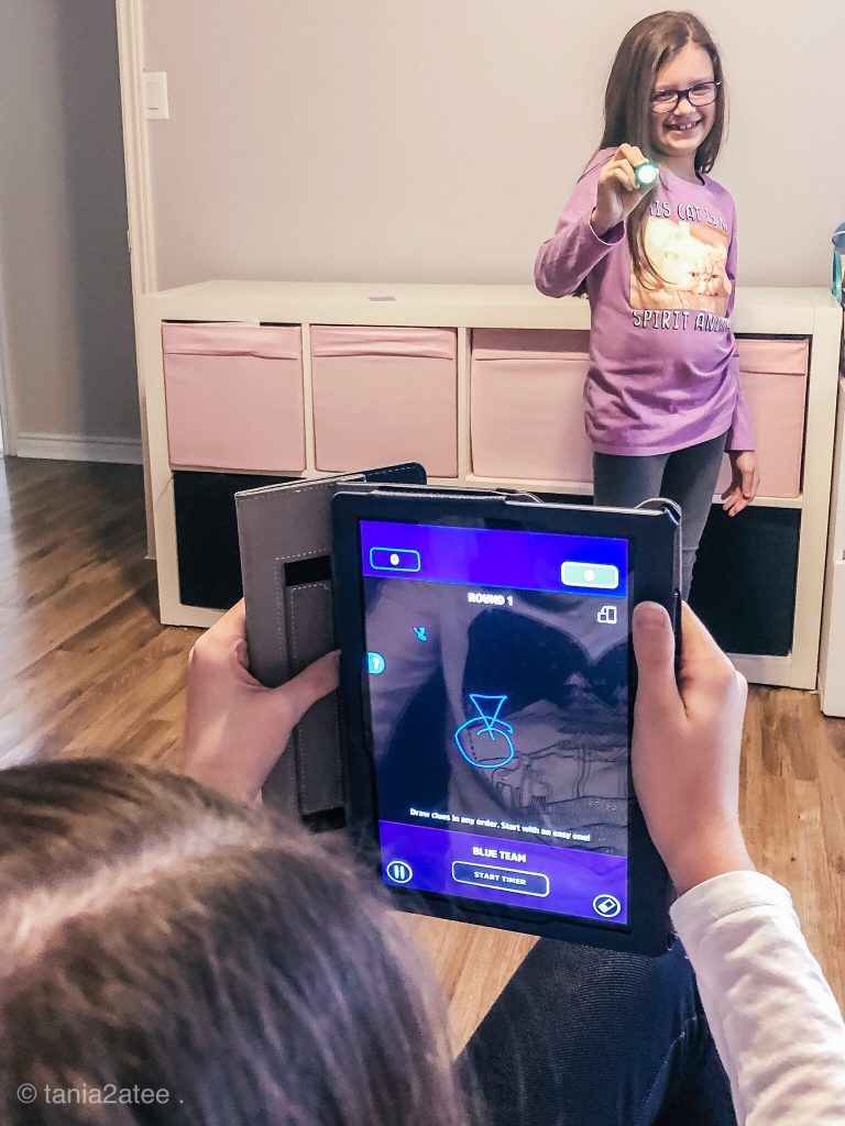 It took a bit of getting used to drawing in the air. You can’t draw wherever you want, and obviously you can’t see what you’ve already drawn, but once the girls got used to it, they loved it. You can adjust the timer in each round, giving us newbies some extra time to draw. With that extra time you can also sketch out the other clues on the card (there are 5 on each card), giving you the opportunity to earn more points.