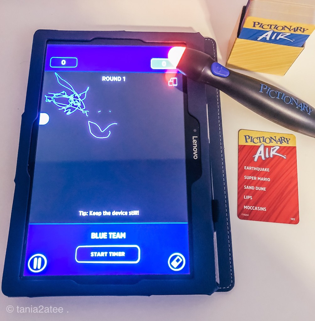The box is small, containing an illustrator pen and the cards with the clues. We downloaded the Pictionary Air app, free on iOS and Google Play on our tablet and we were ready to play. There is even an option to cast your device to your TV for an even bigger image. But we were ready to play!
